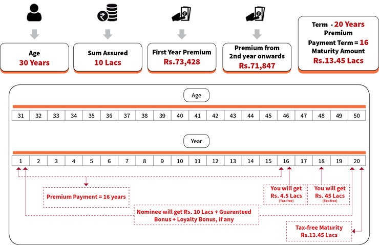 • This plan also has the option of taking the Maturity proceeds in instalments as the policy-holder can choose the no of year as 5, 10 or 15.