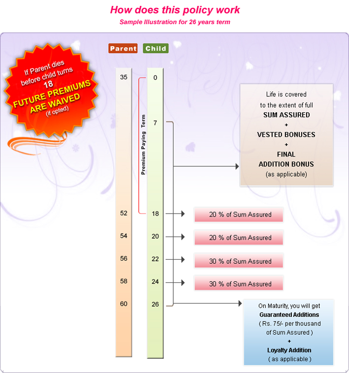 - Premium Waiver Benefit :All balance premiums waived if parent dies before the age of 18 ( if opted )