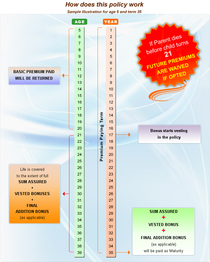 - Policy vests at the age of 21 (I.e.: life cover on the child and bonus vesting starts)