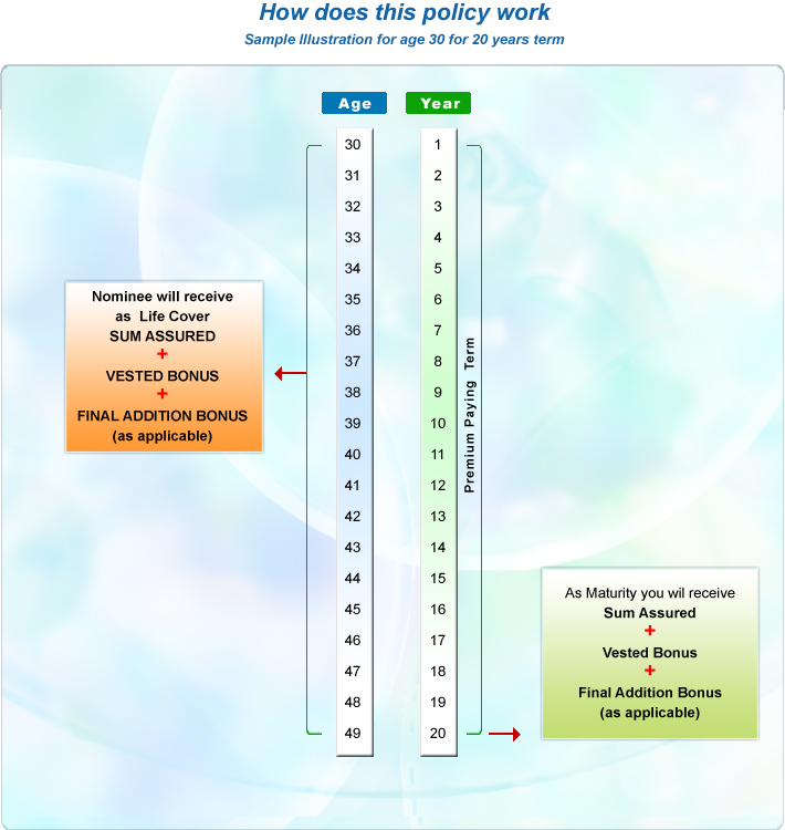 - On maturity of the term, Sum Assured + Bonus + Terminal Bonus (as applicable) will be paid.